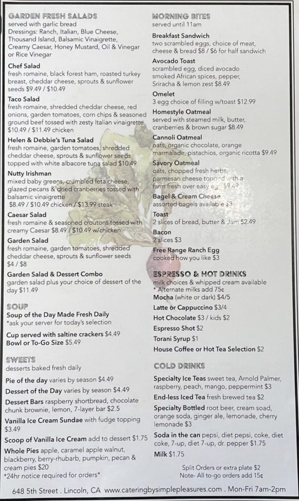 Welcome to Simple Pleasures Restaurant, where New American cuisine meets a commitment to freshness and quality. Located at 648 5th St in Lincoln, CA, this charming eatery has quickly gained a loyal following thanks to its vibrant menu that features an array of delicious soups, salads, and sandwiches.